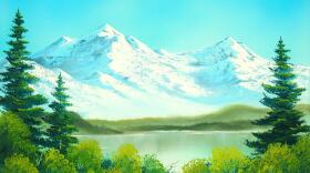 Bob Ross paints a stoic mountain overlooking a smooth-as-glass wilderness lake.