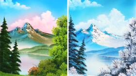 Bob Ross creates the same mountain landscape setting in both summer and winter.