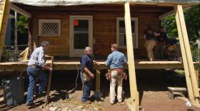 Apprentices frame wall, build drain stack, and decking. Homeowners visit cabinet designer.